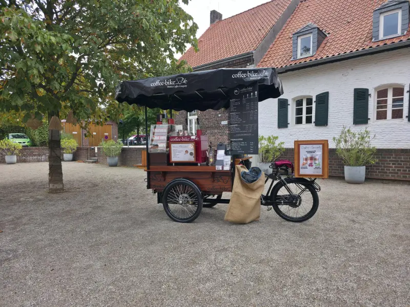 Wir stellen uns vor: Coffee-Bike – Mobiler Kaffeegenuss in Barista-Qualität Mit unserem Coffee-Bike bringen wir erstklassigen Kaffee dorthin, wo Menschen genießen möchten – frisch gemahlen, professionell zubereitet und immer mit einem Lächeln serviert. Unser Sortiment reicht von Espresso, Cappuccino und Latte Macchiato über erfrischende Iced Coffee- Kreationen bis zu saisonalen Specials wie Pumpkin Spice Latte oder Zimt-Macchiato. Ergänzt wird das Angebot durch Bio-Tees, cremigen Chai Latte, heiße Schokolade und pflanzliche Milchalternativen.