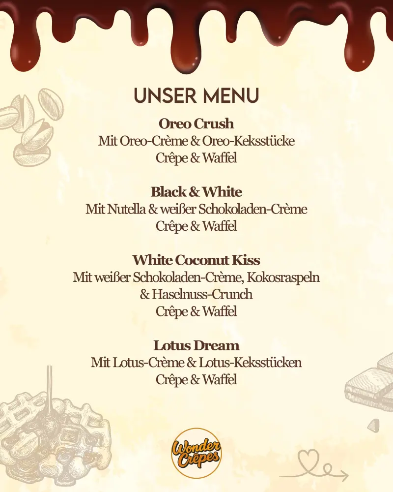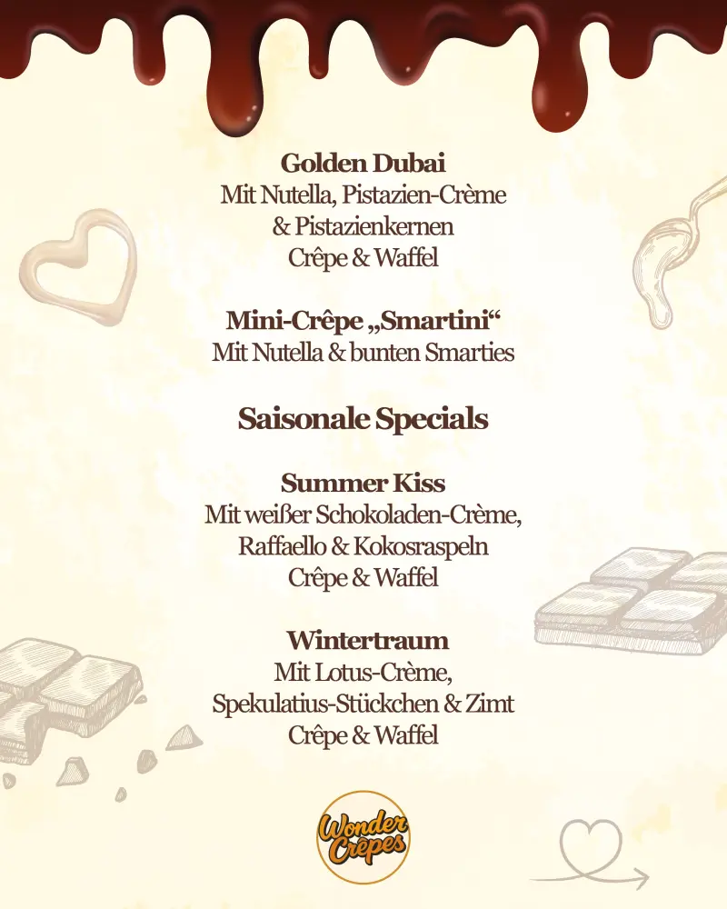 Wir stellen uns vor: WonderCrêpes steht für hochwertige Live-Desserts auf Firmenfeiern, Hochzeiten, Stadtfesten und besonderen Anlässen. In unserem professionell ausgestatteten Foodtrailer bereiten wir frische Crêpes und belgische Waffeln live vor den Gästen zu – sichtbar, sauber und effizient. Unser Konzept eignet sich ideal als Dessert-Highlight, Empfangsbegleitung oder süßer Abschluss einer Veranstaltung. Dank strukturierter Abläufe sind wir auch bei höherem Gästeaufkommen zuverlässig einsetzbar – indoor wie outdoor.
